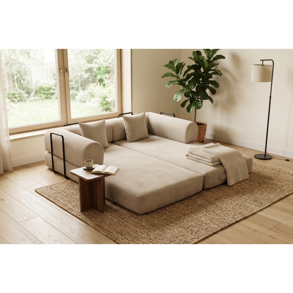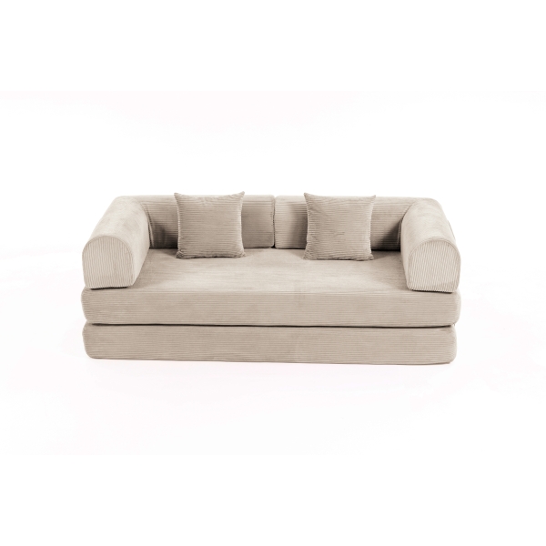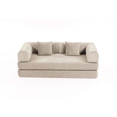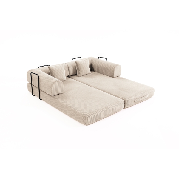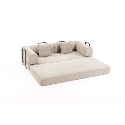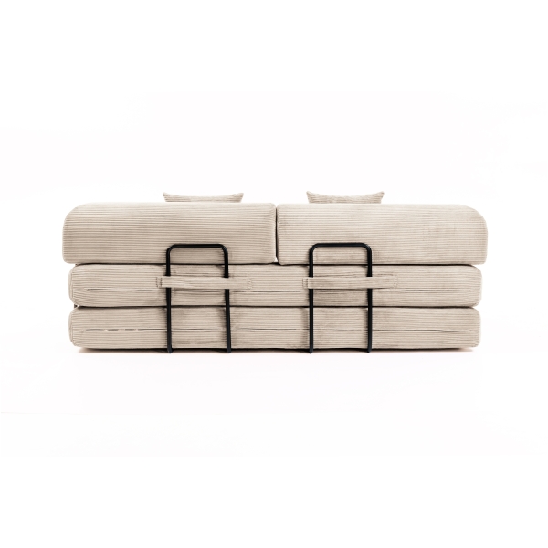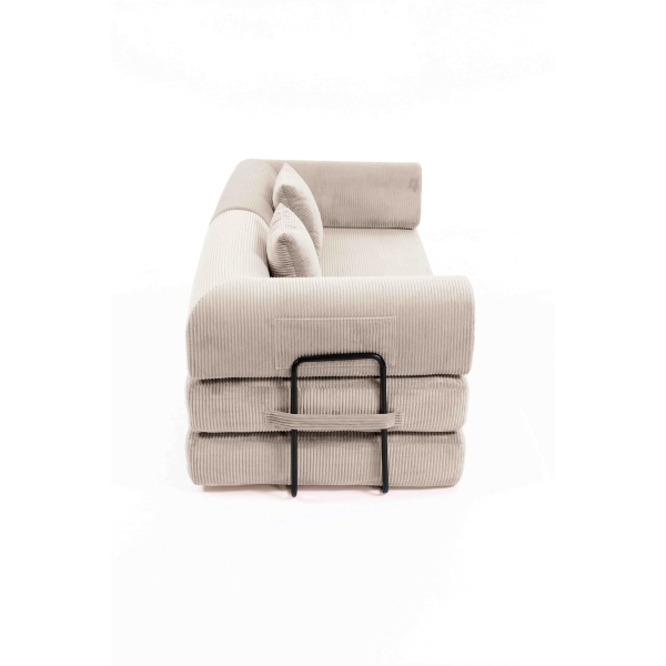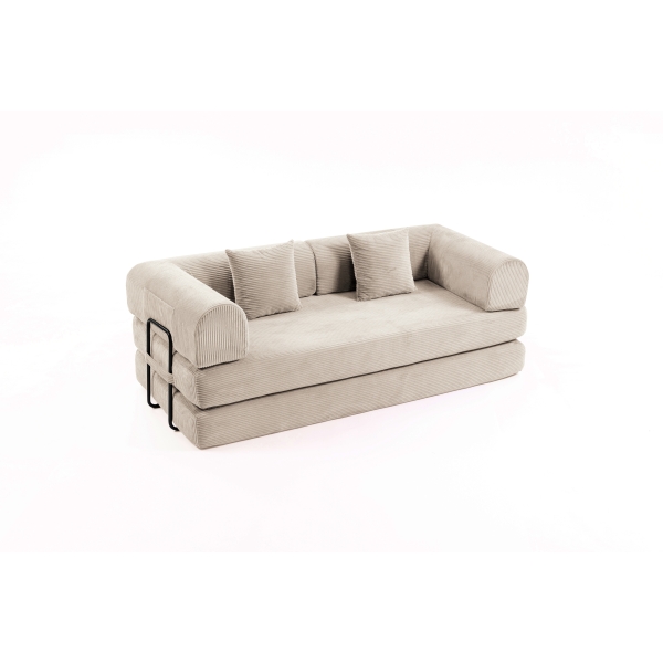 Sofá cama comprimido al vacío Bordecor, convertible, tapizado en pana beige suave, 200x94x74 cm, espuma de alta densidad, diseño moderno con estructura metálica lateral y dos cojines incluidos.