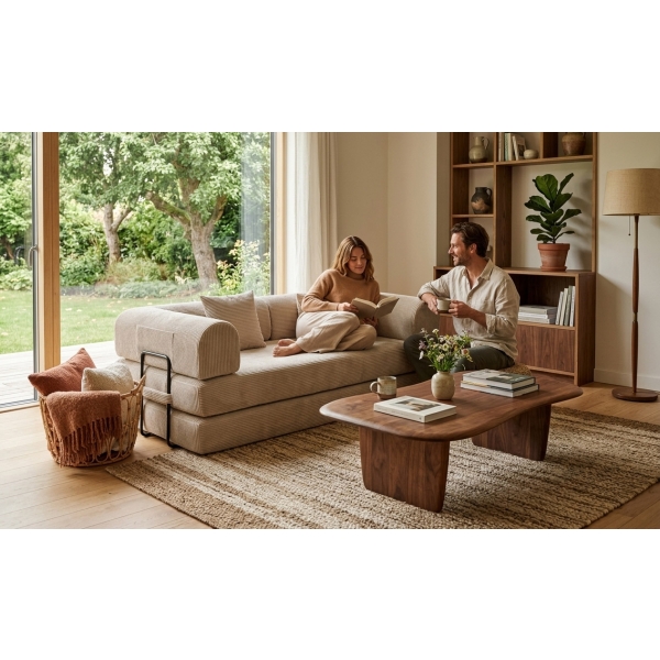 Su tapizado en tejido de pana suave en color beige aporta un aspecto cálido, moderno y elegante, combinando fácilmente con cualquier decoración. Incluye dos cojines a juego para mejorar el confort y la estética del conjunto.