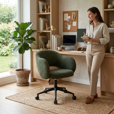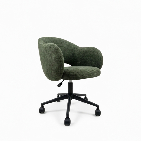 La silla Errai de BORDECOR combina estilo y funcionalidad para crear un espacio de trabajo cómodo y elegante. Su diseño envolvente proporciona una sensación acogedora, mientras que el tapizado en tela verde oscuro aporta sofisticación y suavidad al tacto. Equipada con un mecanismo regulable en altura y base giratoria con ruedas, esta silla se adapta a tus necesidades, ofreciendo libertad de movimiento y ergonomía. Perfecta para oficinas en casa, estudios o espacios creativos, la silla Errai es sinónimo de confort y diseño contemporáneo.