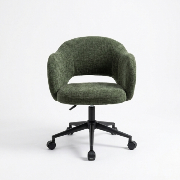 BORDECOR: La silla Errai ofrece un diseño envolvente y acogedor, tapizada en tela verde para máximo confort. Ideal para tu espacio de trabajo en casa, con altura regulable y base giratoria.